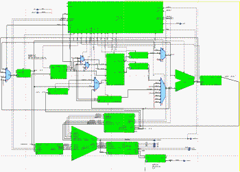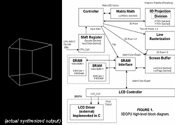 Summary: For this project, we designed and built a 3D Graphics Processing Unit. The unit supported w-buffering, hardware line rasterization, 3D projections, and matrix operations. It was actually tested on FPGA hardware using a simulated LCD controller/display written in C. We were awarded the ECE 495d AMD Wafer Award for Design Excellence. I should also note that this design is not pipelined (as you can plainly see in the block diagram). The team members were James Doty, Kyle McGhee, Allan Patterson, and myself.