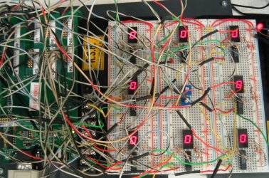 Summary: This was the first major hardware project I embarked on, consisting of a Motorola HC12 processor controlling a bank of eight 7-segment LCDs to play a game of Memory. The user inputs his selection on a nearby computer which communicates with the processor through a serial port. This interface could easily have been connected to buttons instead. My team members were Andrew Keller and Kevin McCann.