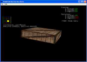 Summary: Written for the PHANToM force feedback device, this demo attempts to simulate as realistically as possible one of those wooden boxes with a maze and a marble inside, except you can't see the insides. The real physical game only lets you know data through tactile and audial clues, and the same goes for this version. My goal was to make it so you could get the marble out 100% without visual cues, and I think I got it pretty close. It feels really good for a haptic demo in my opinion.